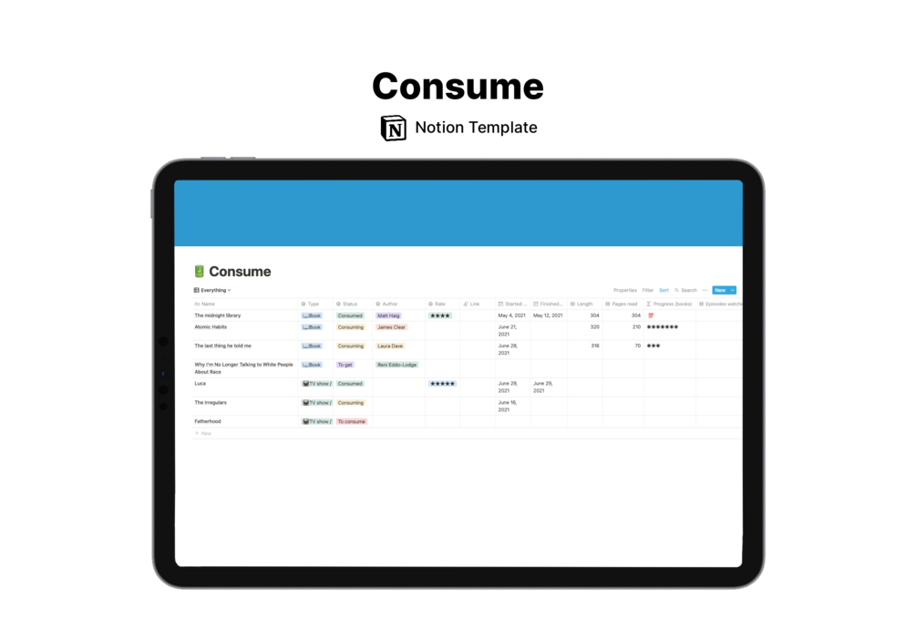 Do you need to keep track of the books you read, the podcast you listen to and the movies/tv shows you watch? This is the template for you!